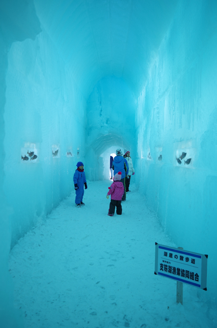 中は氷のトンネルなんかが作ってあります。ここは支笏湖で取れる魚が氷付けにされて壁に埋め込んでありました。
