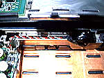 真です。パームレストもトラックパッド部分にマザーボードへのコードがありますので、慎重に外してください。左側の銀の部分がハードディスクマウンタ、真ん中の銀の部分は電源基盤のカバーです。右側の銅色の部分は、バッテリーが入っているところです。 |