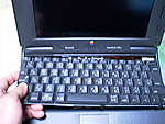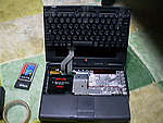 | キーボードを外したら写真のようにテープで液晶に貼り付けると作業がしやすいです。メモリの交換はここで行います。ちなみに190の左手に見えているのが、普段使っている無線LANカードです。 |