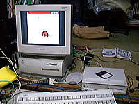 モニタがないので、7200に付けているモニタをちょっと拝借。しかし本体が小さいですねー。ほとんど同じ時期の発売マシンですが、インターフェースはFM-Vの勝ちですね(笑)。 |