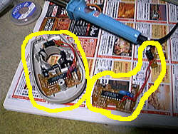 | わかりずらい写真ですみません(汗)。左がマウスの上を取ったところ、右はマウスから基盤を引きずり出したところです。よく見てもらうとわかるのですが、二つの基盤がコードで繋がっています。上の方にある小さい基盤がクリック用、下の方の大きな基盤がスクロール用です。間には赤いコードが2本あります。このコードをちょん切ってもう一方のマウスの基盤とくっつけちゃえばいいのですが、ゴールデンウィークということもあり、少し手間をかけて半田付けしてあげましょう。基盤から半田ごてでコードを外しても、それほど難しい作業ではありません。要は半田ごてをしっかりと暖めてから、慎重に作業すれば簡単にコードを外せます。二つともそれぞれ外した後で、基盤を組み替えて逆の手順で半田付けです。 |