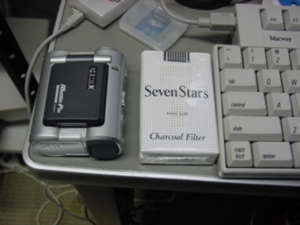 | お約束の「タバコとの比較写真」を撮ってみました。小さいです!本当に小さいです!最初に箱を開けたときに「間違えて買ってきた!」と思ってしまったほど小さいです(笑)。 |