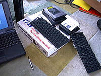 | MOにバッテリー充電器、英字キーボード2枚とバッテリー3個。日曜の朝一番に届きましたが、急いで朝ご飯の支度をして奥さんに食べさせ、すぐに箱を開けて中身を取り出し、PowerBookもいそいそと開けだした私を見て、奥さんも苦笑いです。でもここんとこ奥さんだってLinuxいじりに夢中だったので、このくらいは大目に見てもらいましょう(笑)。 |