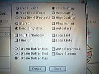 | この辺で細かいセッティングをします。私は英語が本当にダメなので、なんだかよくわからないのですが、Lowセッティングでモノラルの音質最低、バッファは最大で使用しています。これじゃないと190では音が途切れてしまって、うまく再生されません。この設定でi-Textを起動すると、起動にはかなり時間がかかりますが、起動してしまえば、案外快適にテキスト入力できます。音が途切れることもほとんどありません。しかしテキストの保存や終了は、かなりの時間がかかります。これはMP3再生にCPUパワーのほとんどを利用していて、Mpeg-Decが掴んでいるメモリやCPUを離してくれないためだと思われます。ま、そんなにパワフルな使い方なんか最初から期待していませんから、音が鳴りつつテキスト入力できたことでよしとしましょう(笑)。 | ||