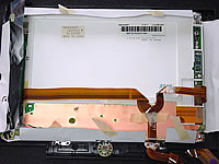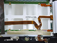 | するとボディ側にネジ止めされているヒンジ部分が見えますので、そーっと液晶を「普段はありえない角度」まで倒してみてください。そしてこのネジを外せば液晶とボディが外れます。この時にマザーボードと液晶をつなぐリボンケーブルが左側クラッチのすぐ下にありますので、外し忘れないようにしてください。 |