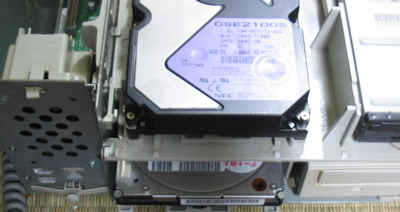 | 近所にできたジャンク屋さんで2GのIBMハードを買ってきて取り付けました(下段)。こちらの方が静かで早いようなので、起動ディスクにしました。 | ![]() |