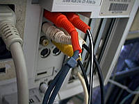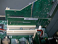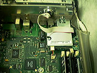 上の赤丸が前の写真のモデムポートを裏から見たところ、右下の赤丸がモデムスロットです。上の赤丸のところにシリアルポートのコネクタがくっついて、そこから配線があって、右下の赤丸に基盤がくっつくわけです。非常に簡単です。