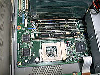 これがPen120のCPUです。なんだか680X0みたい。メモリもSIMMが積んであります。中身をちらほら見てみたんですが、一々ネジを外さないと部品が取れないので、めんどくさくてそのままハードディスクを突っ込みました。そしたら今までWin95で起動していたのに、うんともすんとも言わなくなってしまいました。