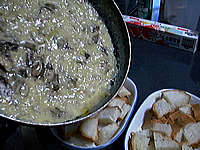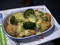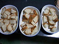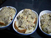 まず、耐熱皿に切ったフランスパンを乗せます。そしてオリーブオイルでタマネギを飴色になるまで炒めて、塩・こしょうと挽肉少々を入れ、更に炒めます。そこへ牛乳を適量 入れ、沸騰したら小麦粉を入れて、とろみが出たところでバター投入。