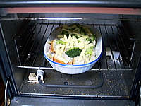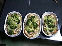 それを先ほどのパンの上にかけます。あ、彩りが寂しいのでブロッコリーなんかを茹でておくといいですね。