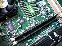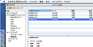 ってこれじゃ何にも見えませんね(汗)。いちおう320M、ビデオカードも別に刺したので、丸々システムで使えます。ということでWin2000はそこそこ快適になりました。 しかし、当初の目的はそんなことじゃありません!メイン環境のMACを更に快適に!!!それこそが目的なのです!!そこですぐに別 のメモリを物色。するとあるじゃーありませんが、両面実装の128が(予算の関係で256には手が届かず)。さっそく買って取り付けました。