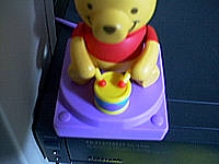 前にある左右の2つのボタンはアプリケーション起動ボタンに割り当てることができます。今もキーを打ち続けている私のよこで、太鼓をたたきながら首を左右にふるプーさんが・・・。しかもキーを叩くごとに効果 音が鳴り響きます(苦笑)。違うんだよプーさん、メインマシンが起動しなくて、それどころじゃないんだって(笑)。 |