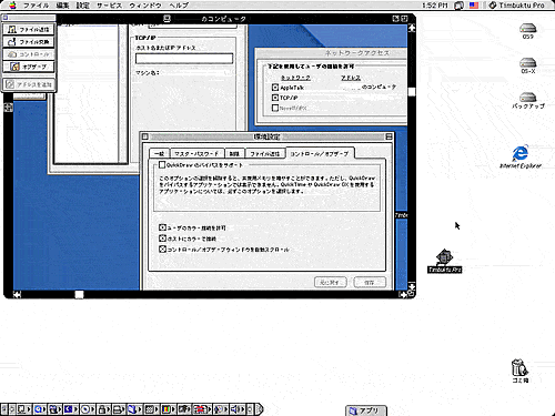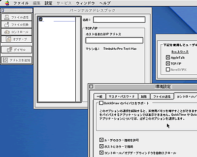 Farallonから出ていたTimbukutu Pro 2.0です。先だって中古DOS屋さんで目に付いたときに、どういうソフトなのかちょっとわからなかったんですがとりあえずGETしておいたものです。これがネットで調べてみると、どうやらビジネスソフトらしいのですが、リモートデスクトップが可能みたいなんですね。現在も10.2対応品まではリリースしているみたいです。ちなみにこの2.0はMacOS7〜 7.6までは対応が謳われています。我が家ではLC520が7.5.5Eをインストールしてありますが、そんなに非力なマシンで試したのでは起動すらしなさそうです(笑)。そこで敢えてB&W(9.2.2)とDT(9.2.1)で試してみることにしました。まずはDTにインストール。フロッピーからのインストールってなんだか久しぶりで新鮮ですね (笑)。あっさりとインストールできました。すぐに起動して設定します。