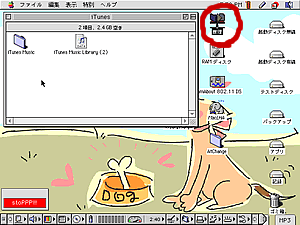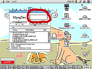 まずはAppleTalkで樹理MAC DTのハードディスクをマウントし、書類フォルダにあるiTunesフォルダからため込んだ音楽ファイルを探します。次に68kでMP3が聞ける魔法のアプリ(笑)「MpegDec」を起動して、楽曲が入ったフォルダをドロップします。