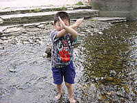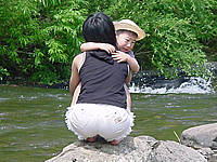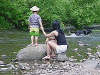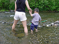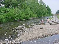 虫網を川の中に突っ込みながら「お魚さん」を一生懸命探しているみたいです。奥さんを引きずり回し、その後は私が引きずり回されました(苦笑)。家族連れもたくさんやってきて、まわりの皆さんは炭を熾しはじめました。北海道ではこの時期、外で炭を熾してジンギスカンを焼きまくるというのが慣わしみたいなんですね。大雨の日なんかでも車庫の中で炭を熾してジンギスカンを食べていたりします(汗)。