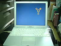 さて、先週の日曜日にライブを見に行った時、実は野瀬さんからibookを預かってきていたんです。それはモニタが映らなくなったibookのデータをバックアップするためです。ちなみに、起動時に「T」キーを押しっぱなしにしておけば、ターゲットディスクモードで起動してくれます。