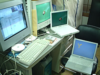 SCSIディスクモードではPowerbook190CをG3DTに繋いだことがあったんですが、ファイヤーワイヤーでの接続は初めてです。こんな風になるんですね。でもSCSIディスクモードと見た目はほとんど変わりませんね。しかし狭い私の机の周りは、こんな風にMacだらけです(笑)。