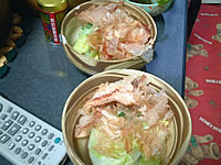 早速花鰹を使っておかかネギ(左)と白菜のおひたし(右)を奥さんが作ってくれました。う〜ん、非常においしいです♪木曜日のお弁当に海苔弁も作ったのですが、奥さんに大好評!早速削り箱を用意しないと!!善麻呂さん、本当にありがとうございます♪