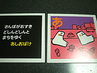 五味太郎の「あいうえおばけだぞ〜かるた」です♪奥さんがこどもの日に樹理に買ってあげた物です。私も五味太郎の絵や文章が好きなんですが、樹理も気に入ってくれたみたいです。小学校に入る前に、ひらがな覚えてくれるかな〜?