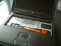 で、これが問題の内蔵電池です。8カ所熱止めしてあります。意地でも自分では交換させないって態度の現れでしょうか(笑)。今回はこれの紅白ケーブルの出ている方と反対側を4カ所外して電池を取り出します。この時に完全に外してしまわないようにしてください。ここは右のパームレストの裏側、つまり拡張ベイの中にCDを格納する場所です。きれいに電池を戻さないと、CDドライブが引っかかっちゃって、拡張ベイが使えなくなってしまいます。