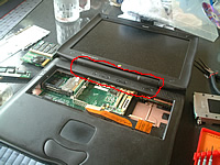 液晶を「これでもかっ」てくらい倒して、赤く囲ってあるところを外し、液晶をマザーボードが繋がっているリボンケーブルを外します。それから本体後ろのポート類が並んでいる場所の左右4本のネジを外します。これで液晶が外れます。その後、本体裏側の8本のネジとマザーボード上の4本のネジを外すと、本体がバラけます。