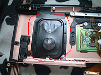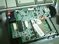 まぁ、今週の改造は根気よくやれば、作業自体は難しいものではありませんので(笑)。では早速MotionPix本体をばらしましょう。赤丸で囲っている部分のネジとリボンケーーブルを慎重に外して下さい。すると液晶側が外れます。