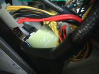 そこで中をよく見てみると、HDDの増設してあるケーブルにMaster/Slaveの印があります。これってケーブルセレクトってやつかな〜?と思い、HDDを一旦外してジャンパの設定を見てみると、MasterにもSlaveにもSlaveで取り付けてあるんですが(汗)。一応これをケーブルセレクトに変更して付け直してみました。