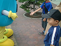 子供たちに意外と人気だった下水道科学館のキャラクター「クリンちゃん」です。樹理も頭をなでてもらったりしたんですが、やっぱりビビッてますね(笑)。