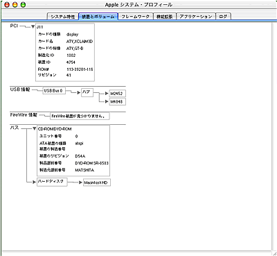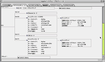 で、樹理のDTはというと、あれ?モニタが2台?そうなんです。メインディスプレイはRAGE128に繋いで、サブのディスプレイがオンボードに繋いであります。なぜこんな設定になっているのかというと、DVDビデオを見るにはモニタをRAGE128に繋いで、パッチを当てたApple DVD Playerが必要なんですが、ビデオやゲーム(セガサターン)を映しているAppleビデオプレーヤーはオンボード接続のモニタにしか映像出力できないんです。