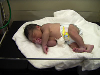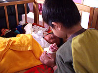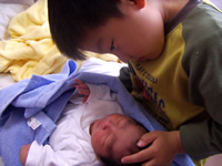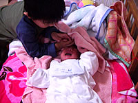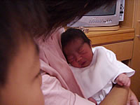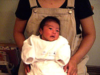 出産を終えるとおばあちゃんも呼ばれてご対面です。しかし大きな子供ですね(汗)。生まれたばかりの子供はサルのようだとよく言われますが、やっぱりサルみたい(笑)。でもかわいく感じるのは、やっぱ親バカなんでしょうね〜(笑)。