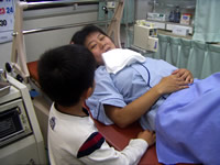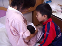 それから待つ事1時間ほど、看護婦さんから「旦那さんとお兄ちゃん、奥さんが呼んでますよ」と言われて、どきどきしながら分娩室へ。奥さんが大変なのが樹理にも伝わったんでしょう、樹理も緊張気味で私にくっついていました。