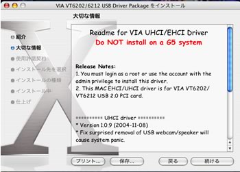 インストールは.pkgをダブルクリックでインストーラが立ち上がり簡単なのですが、途中で「G5にはインストールするな!」とか「G4専用だよ」とかって書いてあります。