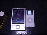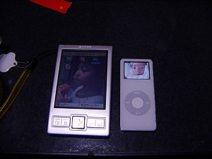 今日まで携帯音楽プレイヤー兼文章閲覧マシンだったzaurus SL-A300とも比べてみました。どちらも液晶照度最大です。フロントライトとバックライトの違いがあるとはいえ、これほど違うとちょっと(汗)。ZAURUSのいいところは画面が大きいところくらいになっちゃいますね〜。このZAURUSの大きさでスーツの胸ポケットにほぼぴったりでしたから、iPod nanoは持ってる事を忘れるくらい小さいですよね。