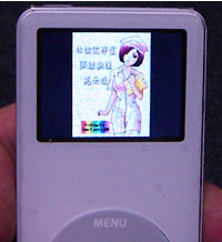 対応フォーマットはJPEG、BMP、GIF、TIFF、PSD(Macのみ)、PNG(iPodで表示可能なサイズに変換)ということなので、デジカメ画像(Jpeg)以外はなにがいいかな〜?と思っていましたが、やはりわれらが冴子さんを表示してみようということで、ブラウザから保存させて頂きました。GIFもきれいに表示されていますが、さすがにアニメーションにはなっていないみたいです。
