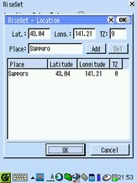 次に「RiseSet」という月の満ち欠け、日の出・日の入り時間を計算するアプリケーションを入れてみました。