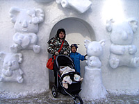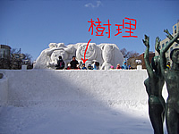 一滑りして樹理が落ち着いたところで、ぐるっと会場を廻ってみることにしました。まずは西5丁目の自衛隊作品です。沖縄がテーマの雪像だそうです。大きいですね。