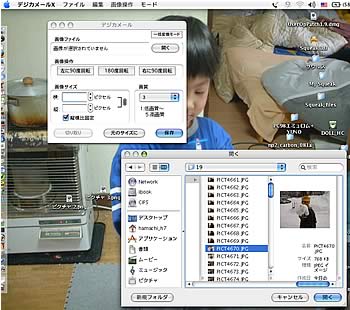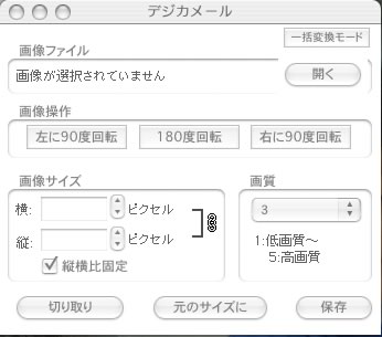 ザウルスで大きな画像をリサイズできるアプリを見つけられなかったので、今回はMac側でリサイズしてあげることにしました。色々な画像加工ソフトがありますが、Piviのプリント精度を考えると画像自体はそれほど手間をかけてリサイズする必要はなさそうなので、フリーウェアで複数画像を一括変換できるものを探します。すると用途にぴったりのフリーウェアがみつかりました。「デジカメール」というソフトです。これはデジカメで撮った画像を、手軽にメール添付できるサイズにしてくれるというものです。
