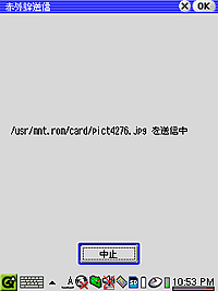 ザウルス側ではFinderからファイルを指定し、ファイルメニューから赤外線送信します。送信が終了すると、自動的にこの画面が閉じてFinderに戻ります。