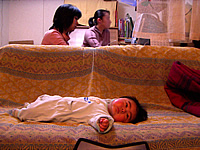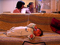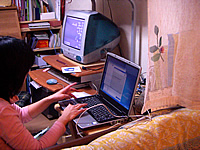 写真ばっかり撮ってたら怒れそうなので、私もちょっとセッティングを手伝いました。今回はiMacとADSLモデムがピアツーピアで繋がっていたものへ、Windowsマシン+ネットワークストレージを追加するというものです。しかしモデムにはルーター機能は付いていません。一応自宅に余っていたHUBを持っていき、Win・Macともに、どちらかがダイヤルして繋がる設定にはしてみました。でもNASがiMacからうまく認識できません。色々と考えた結果、TCP/IPがPPPサーバを参照する設定になっていたんですが、ダイヤルアップしなければ自分自身のIPが決められず、それでNASを見に行けないみたいな感じがしたので、設定を変更してみましたがどうもうまく行きません。う〜ん。とりあえずルーターを探して差し上げるからってことで、iMacを初期のダイヤルアップに設定し、Winノートは1週間スタンドアローンで使ってもらおうってことで引き上げたんですが、その後「Windowsが起動しない!!」という連絡を受け駆けつけてみると、先ほど購入してMicrosoftへアクティベートもしていない、数回しか起動していないOSが「dllを見つけられない」などと言って起動しません(汗)。XPのSP2ってそういう仕様なんでしょうか(笑)。現場ではリカバリすら受け付けないのでとりあえず引き上げて、現在も奥さんが復旧中です。
