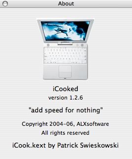 帰ってきてから久々にじっくりMacをいじったので、ちょっとフリーウェアをご紹介しましょうか?最近はパソコンいじりのネタがなかったし(笑)。ibookのG3最終モデルをクロックアップできるGUIアプリケーション「iCooked」です。うちのibook late2003 G3 800Mhzはばっちり対象機種なので、やらない手はありますまい♪しかもGUIでお手軽に設定できちゃいますし!