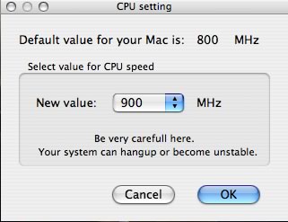 こんなにクロックがたくあさんあると迷っちゃいますね♪ とは言っても、CPU自体がもともとは800Mhzのものですから、そんなに早いクロックにできるわけはありません。うちでは900Mhzに設定して使っています。たった100Mhzですが、それでもFinderは心持ち早くなった気がします。アプリの起動もサクサクいくようになったし。
