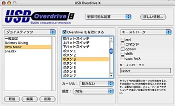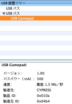 ふふふぅ〜ん、さてさて、まずはibookに付属している「Otto matic」でテストしてみようかな〜♪ って、あれ?なんだかまったくゲームパッドからの入力を受け付けないじゃありませんか! 何もしなくても動くんじゃないんかい!おかしいな〜。まぁ、買ったばかりで動かないのは癪に触るので(ジャンク品じゃありませんし)、とにかく調べましたよ。そしたらなんと、プレインストールアプリなのに、OSXではGamesproketsに対応していないじゃないですか!!!そんな〜。で、更に調べてみると、ほとんどのアプリケーションで対応していないんです。OSだけ対応しててもしょうがないじゃん(泣)。