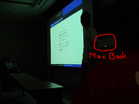 最初は「Debian勉強会:Debianのインストールの仕組みを紹介してみます」というプログラムです。なぜかMacBookにDebianをインストールしてました(笑)。しかもApple Remoteコントローラ使ってプレゼンしてます。ここでちょっと聞きかじった話によると、なんでもMacBookの内部アーキテクチャはUSB接続なんだそうです。へぇ〜。
