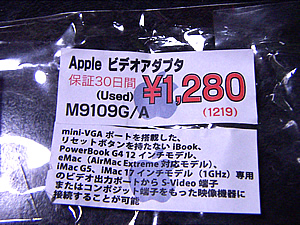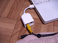 ibook用の外部ビデオ出力アダプタです。私のibook G3 800にはPCモニタ用の外部出力アダプタは付いていたのですが、テレビモニタへの出力用アダプタは付属していなかったんです。でも出先に常にPCモニタがある訳はなく、テレビモニタに出力できたらデスクトップが広く使えていいのにな〜なんて思っていたんです。というわけで、価格も1,280円だし、即購入しちゃいました♪