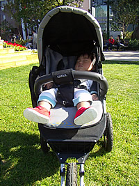 ちなみにおじいちゃんからの誕生日プレゼントは三輪車です。奥さんと相談して、ラジオフライヤー社の三輪車にしました。対象年齢は1歳半からなので、まだまだ漕げるわけはないんですが。・・・それにしても足が届いていませんね(汗)。