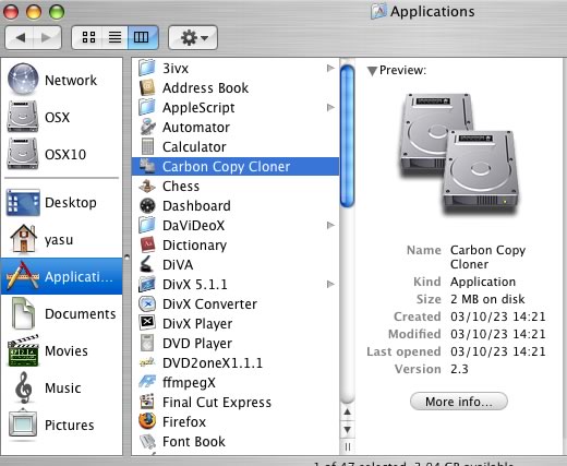ちゃんとそれをやってくれるツールがあるんですが(笑)。Carbon Copy Clonerです。しかし注意しなきゃならないのは、日本語環境ではうまく動いてくれないみたいなんです。ということで、臨時にユーザーを追加してそのユーザーでログイン。システム環境設定の言語環境で「English」を一番上にドラッグします。ま、英語環境にするんですね。それから起動すると、きちんと起動してくれます。