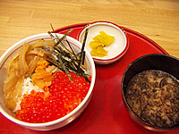これ、本当はうにといくらで1,000円の丼なんですが、一緒に行った上司が「3色で1,000円でえぇやろ」と値切って、イカも入った3色で1,000円の丼にしてもらいました(笑)。