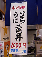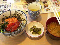 さて、翌朝は鮭いくら丼(500円)で朝食です。なぜか朝食付きのホテルが会社の意向で予約できなかったもんで、わざわざ外で食べました。でもこれで500円ならいいかな?いくら側をまず食べて、鮭側は鮭茶漬けにしちゃいました(笑)。なんだか食べてばかりのような感じですが、もちろんちゃんと仕事もしてるんですよ。でもこの日記見てると食べてるばかりだけど(笑)。さて、今日はまた東京日帰りだ(泣)。