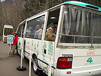 実はここ、豊平峡は豊平峡ダムによって作られた人造湖ですが、周辺の環境保護のために手前の駐車場から電気バスに乗り換えて行くんです。なんだかちょっとエコな感じです。でもここに来るまでに散々ガソリン使ってるんですが(笑)。
