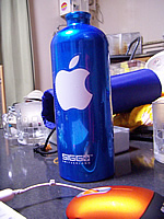 で、あまりにシンプルでちょっと寂しいので、こっちにもAppleステッカーを貼ってみました(笑)。きれいな青に白いステッカーが栄えていい感じです♪このボトルを、すでに1ヶ月近く毎日持ち歩いているわけです。そんなわけで、目論見通りジュース代は激減、1ヶ月でボトル代はペイできそうです。しかし会社内では「なんだかエコな人」というイメージが付いてしまったみたいで・・・。ただお小遣いの節約なんだけどな〜(笑)。